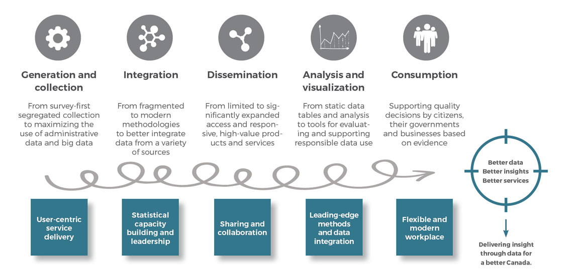 Statistics Canada's reputation as the country's premier, trusted data provider, and the agency's recognized expertise as a data steward, will further drive the modernization agenda toward an enterprise-wide (whole-of-government) approach to strategic data management with a focus on collaborative approaches to providing data and insights.
