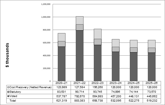 The graph and table above show that spending peaked in 2021–22 when the 2021 Census of Population and Census of Agriculture were conducted. This is followed by a significant decrease in subsequent years as these activities wind down. This pattern is typical for the agency because of the cyclical nature of the Census Program. Funding for the 2026 Census has not yet been approved, and this amplifies the decrease in the overall planned spending. Funding for the 2026 Census of Population and Census of Agriculture is expected to be approved in 2023–24, which would be the first year of funding.