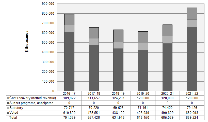 The graph and table above illustrate that voted spending peaked in 2016–17 when the 2016 Census of Population and the 2016 Census of Agriculture field collection activities were conducted. This is followed by a significant decrease in subsequent years as census activities wind down. Spending will begin to ramp up and peak again in 2021–22 when the 2021 Census field collection activities are conducted. This pattern is typical for the agency because of the cyclical nature of the Census Program. Funding for the 2021 Census was approved in 2018–19, with the first year of funding being 2018–19.
