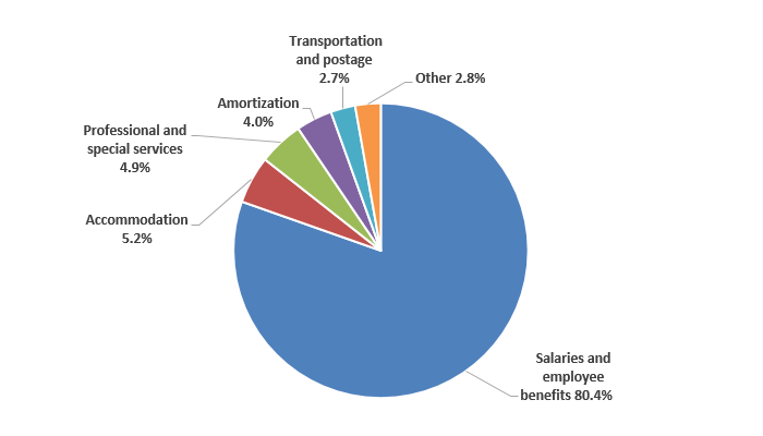 Statistics Canada spent $689.4 million in 2018–19. These expenses comprised $554.5 million (80.4%) for salaries and employee benefits, $35.9 million (5.2%) for accommodation, $33.9 million (4.9%) for professional and special services, $27.4 million (4.0%) for amortization, $18.8 million (2.7%) for transportation and postage, and $18.9 million (2.8%) for other expenses.