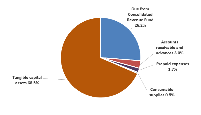 Total assets, including financial and non-financial assets, were $240.6 million at the end of 2018–19. Tangible capital assets represented the largest portion of assets, at $164.9 million (68.5%). They consisted of informatics software ($99.9 million), software under development ($46.9 million), leasehold improvements ($15.4 million) and other assets ($2.7 million). The remaining portion of assets comprised $63.1 million (26.2%) for amounts due from the Consolidated Revenue Fund, $7.3 million (3.0%) for accounts receivable and advances, $4.2 million (1.7%) for prepaid expenses, and $1.1 million (0.5%) for consumable supplies.