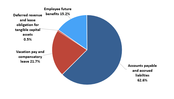 Total liabilities were $126.8 million at the end of 2018–19. Accounts payable and accrued liabilities made up the largest portion of liabilities, at $79.3 million (62.6%). They consisted of accounts payable to external parties ($24.6 million), accounts payable to other federal government departments and agencies ($9.3 million), and accrued salaries and wages ($45.4 million). The next largest portion was vacation pay and compensatory leave, at $27.6 million (21.7%). Employee future benefits made up $19.3 million (15.2%). The remaining portion was composed of deferred revenue and lease obligation for tangible capital assets, at $0.6 million (0.5%).