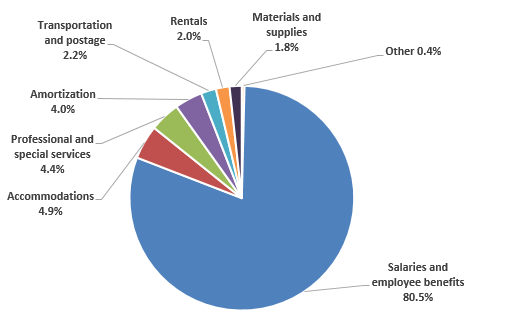 Statistics Canada spent $757.4 million in 2019–20. These expenses comprised $609.5 million (80.5%) for salaries and employee benefits, $37.0 million (4.9%) for accommodations, $33.2 million (4.4%) for professional and special services, $30.2 million (4.0%) for amortization, $16.5 million (2.2%) for transportation and postage, $14.8 million (2.0%) in rentals, $13.3 million (1.8%) in materials and supplies and $2.9 million (0.4%) in other expenses.