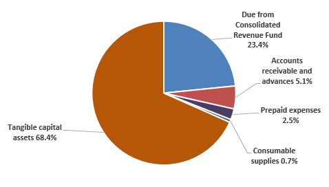 Total assets, including financial and non-financial assets, were $238.8 million at the end of 2019–20. Tangible capital assets represented the largest portion of assets, at $163.2 million (68.4%). They consisted of informatics software ($88.3 million), software under development ($57.6 million), leasehold improvements ($14.8 million) and other assets ($2.5 million). The remaining portion comprised $55.9 million (23.4%) for amounts due from the Consolidated Revenue Fund, $12.3 million (5.1%) for accounts receivables and advances, $5.9 million (2.5%) for prepaid expenses, and $1.5 million (0.7%) for consumable supplies.