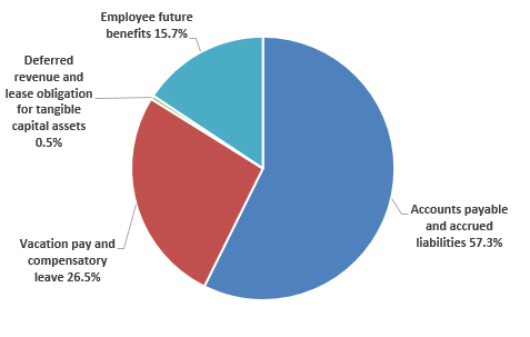 Total liabilities were $130.8 million at the end of 2019–20. Accounts payable and accrued liabilities made up the largest portion of liabilities, at $75.0 million (57.3%). They consisted of accounts payable to external parties ($27.7 million), accounts payable to other federal government departments and agencies ($6.6 million), and accrued salaries and wages ($40.7 million). The next largest portion was vacation pay and compensatory leave, at $34.7 million (26.5%). Employee future benefits made up $20.5 million (15.7%). The remaining portion was composed of deferred revenue and the lease obligation for tangible capital assets, at $0.6 million (0.5%).