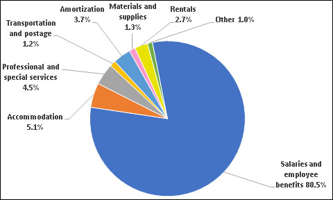 Statistics Canada spent $852.4 million in 2020–21. These expenses comprised $685.9 million (80.5%) for salaries and employee benefits, $43.6 million (5.1%) for accommodation, $38.0 million (4.5%) for professional and special services, $31.5 million (3.7%) for amortization, $23.1 million (2.7%) for rentals, $10.8 million (1.3%) for materials and supplies, $10.6 million (1.2%) for transportation and postage, and $8.5 million (1.0%) in other expenses.