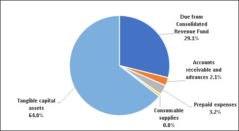 Total assets, including financial and non-financial assets, were $247.4 million at the end of 2020–21. Tangible capital assets represented the largest portion of assets, at $160.4 million (64.8%). They consisted of informatics software ($77.0 million), software under development ($66.9 million), leasehold improvements ($14.6 million) and other assets ($1.9 million). The remaining portion comprised $71.9 million (29.1%) for amounts due from the Consolidated Revenue Fund, $7.9 million (3.2%) for prepaid expenses, $5.3 million (2.1%) for accounts receivable and advances, and $1.9 million (0.8%) for consumable supplies.
