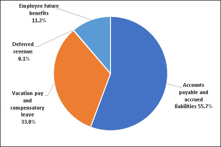Total liabilities were $160.9 million at the end of 2020–21. Accounts payable and accrued liabilities made up the largest portion of liabilities, at $89.6 million (55.7%). They consisted of accounts payable to external parties ($41.7 million), accounts payable to other federal government departments and agencies ($11.6 million), and accrued salaries and wages ($36.3 million). The next largest portion was vacation pay and compensatory leave, at $53.1 million (33.0%). Employee future benefits made up $18.1 million (11.2%). The remaining portion was composed of deferred revenue, at $0.1 million (0.1%).