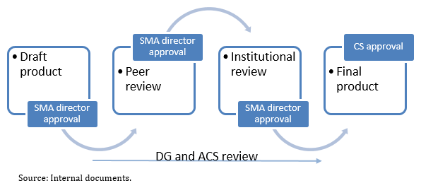With respect to institutional reviews, governance, roles and responsibilities, and processes are reviewed and adapted to ensure that clarity exists and that reviews adhere to policy. This should also include a more effective approval model. In addition, an approach should be developed for earlier approval from senior management on the dissemination strategy.