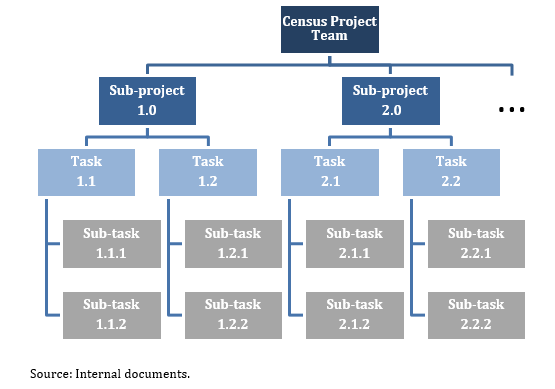 The Strategic Management Committee (SMC),Footnote 2 composed of the Chief Statistician (CS) and assistant chief statisticians (ACSs), acts as the senior governance body for the program. The Census Steering Committee (CSC), which reports directly to the SMC, is composed of senior officials participating in the program. It is co-chaired by the ACS, Census, Regional Services and Operations Field (Field 7), and the ACS, Social, Health and Labour Statistics Field (Field 8). The CSC performs a guidance and information-sharing function. The Census Project Team (CPT), which reports directly to the CSC, is composed of sub-project managers and chaired by the Director General (DG) of CMO. It serves as a decision-making and managing body. A number of working groups (WGs) and committees report to the CPT.