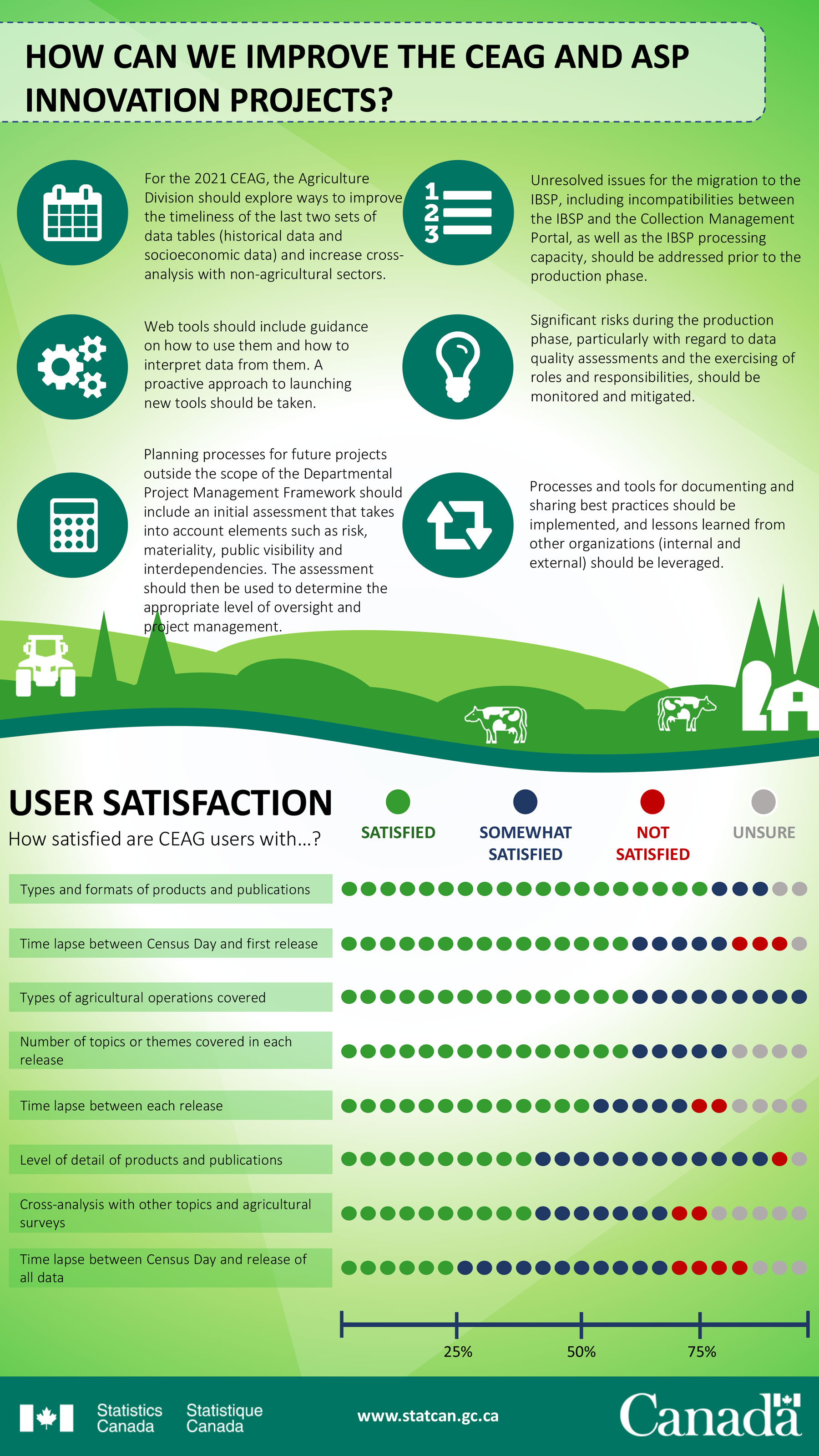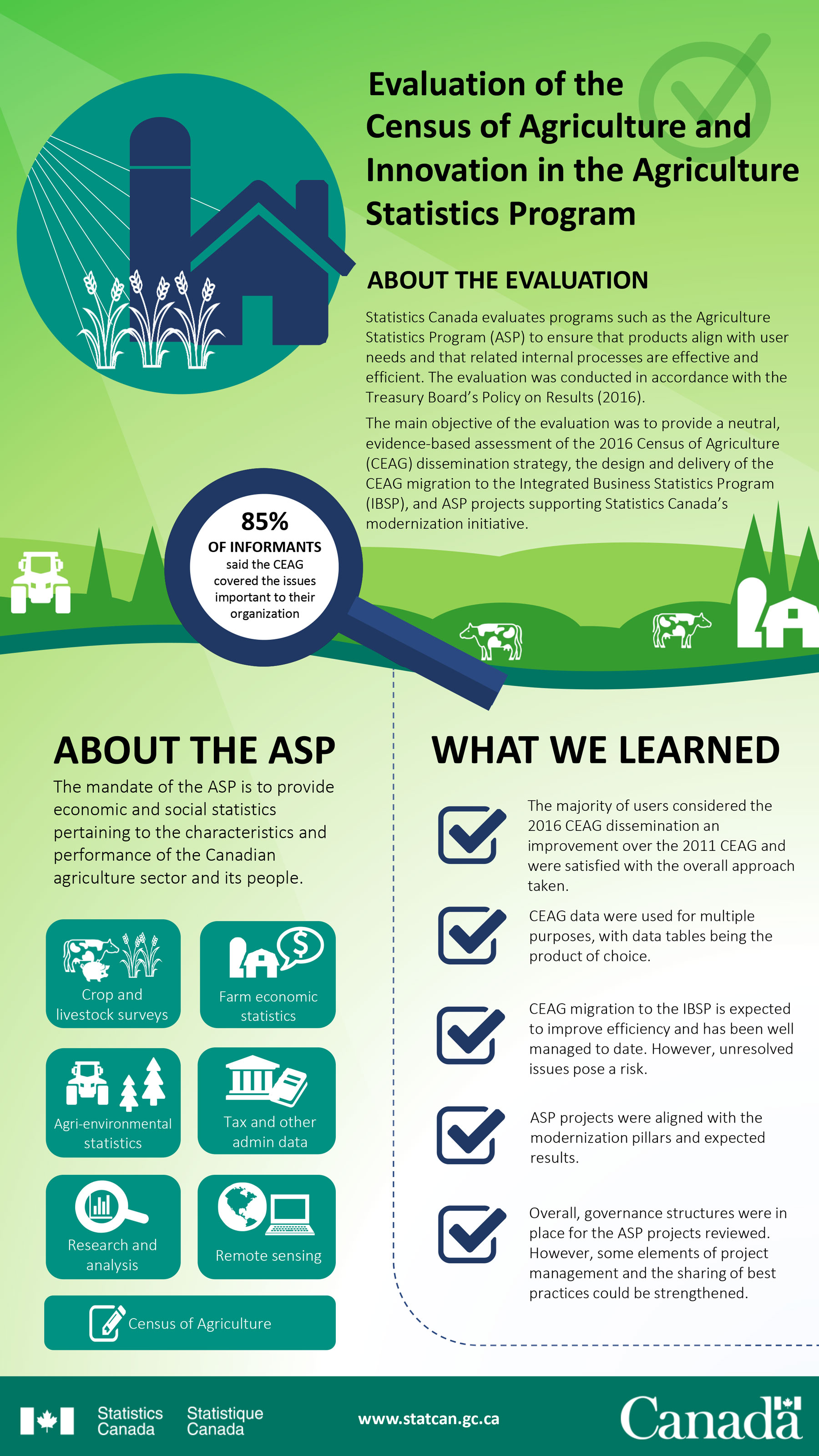 The main objective of the evaluation was to provide a neutral, evidence-based assessment of the 2016 Census of Agriculture (CEAG) dissemination strategy, the design and delivery of the CEAG migration to the Integrated Business Statistics Program (IBSP), and ASP projects supporting Statistics Canada’s modernization initiative.
