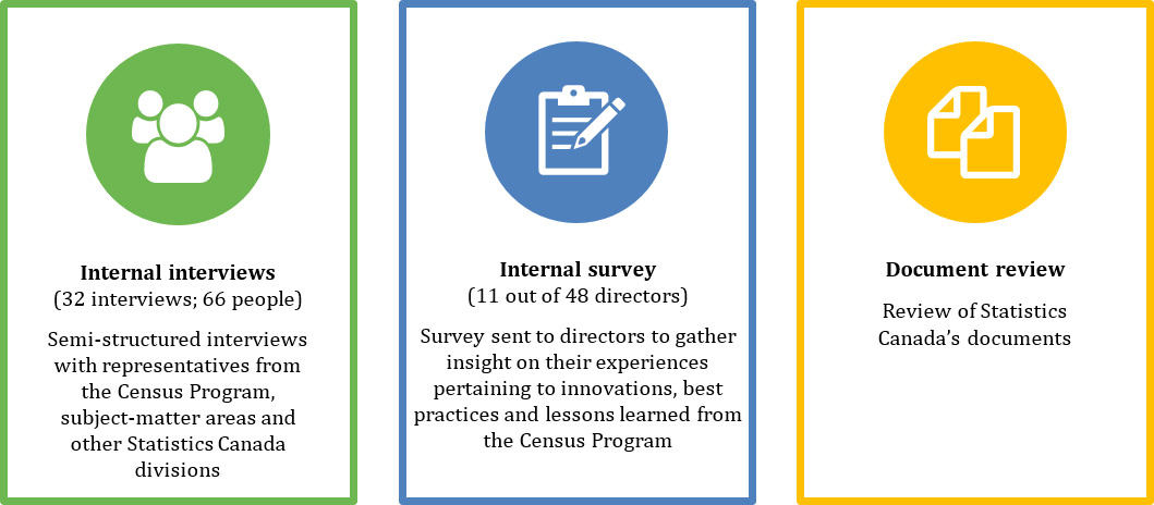 The evaluation methodology consisted of a document review, interviews and an internal survey. Interviews were conducted with representatives from the Census Program, subject-matter areas and other partners within Statistics Canada. The survey was sent to directors. The findings outlined in this report are based on the triangulation of these data collection methods.