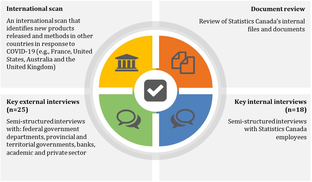 The evaluation methodology consisted of a document review, administrative reviews and key interviews with Statistics Canada professionals working in different divisions within Economic Statistics. Additionally, interviews were conducted with key users and partners external to Statistics Canada. The findings outlined in this report are based on the triangulation of these data collection methods.