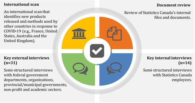 Throughout the pandemic, Statistics Canada has responded rapidly and with agility to the data needs of various users by developing many new products relevant to COVID-19 and its impacts on Canadians. While this response was agency-wide, this report focuses on two types of products that were developed in the context of the pandemic: 1) products derived from crowdsourcing and probability panels, and 2) specific COVID-19 related health statistics.
