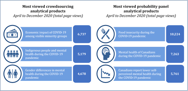 Crowdsourcing and probability panels enabled Statistics Canada to rapidly gather data and produce analysis on how the COVID-19 pandemic was affecting the lives and well-being of different groups of Canadians. Products derived from both methods explored various dimensions of the COVID-19 impacts on Canadians (e.g., education, employment, mental health, child care, discrimination and stigma, substance abuse, community crime, safety and violence during the COVID-19 pandemic).