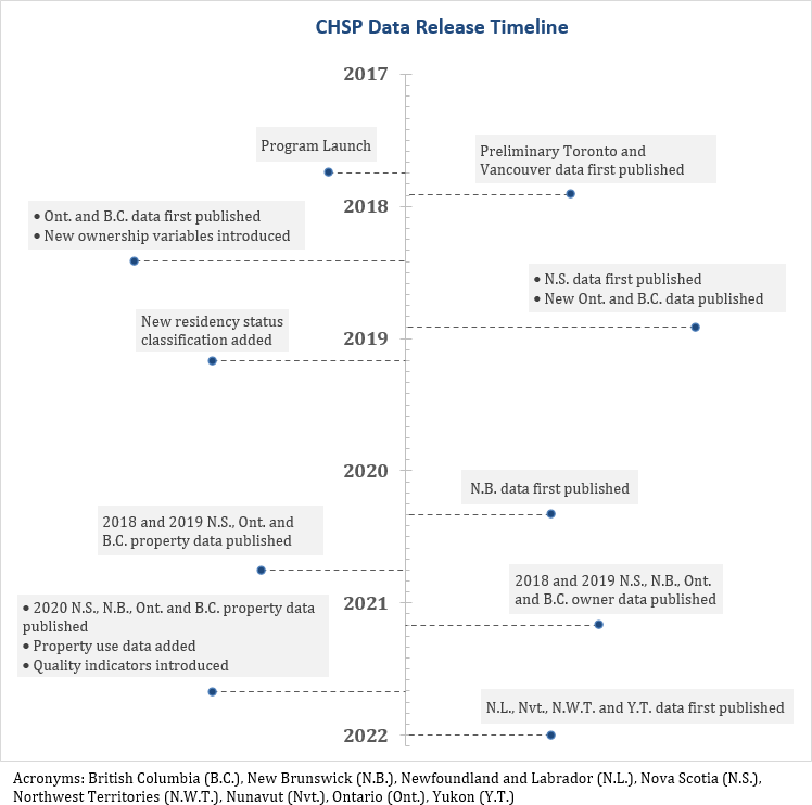 Using an asymmetric approach, data and data products were released as soon as development and analysis were completed. As of January 2022, the released information covers residential properties and property owners for British Columbia, Ontario, New Brunswick, Nova Scotia, Newfoundland and Labrador, Yukon, Northwest Territories and Nunavut. Refer to Figure 1 for a timeline of the CHSP's data releases. Work is underway to add the remaining jurisdictions.