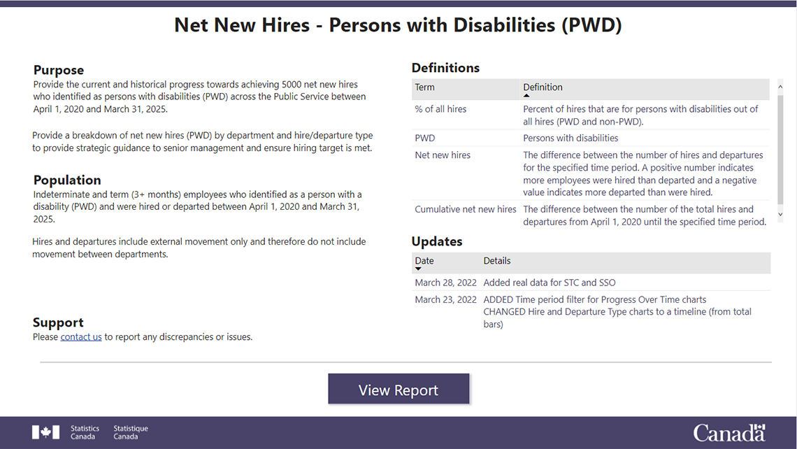 In light of Statistics Canada's particular expertise and mandate in the field of data gathering, processing and analysis, the OPSA reached out to the agency to discuss whether an approach could be developed to monitor progress in near real-time. To this end, Statistics Canada has entered into an agreement with the OPSA and is developing, under the authority of the Statistics ActFootnote 3, a disability data hub with the purpose of leveraging the agency's expertise. Statistics Canada will receive the microdata from agencies and departments in a secure environment ensuring that common standards and definitions are used across the public service, and hence ensure data quality. Agencies and departments will only be required to transmit standard databases instead of completed reports, therefore reducing burden. The data will be processed by Statistics Canada to generate reports. This will allow the production of more timely quarterly reports and ensure coherence in the processing rules. (See Appendix 1 – Disability Data Hub).