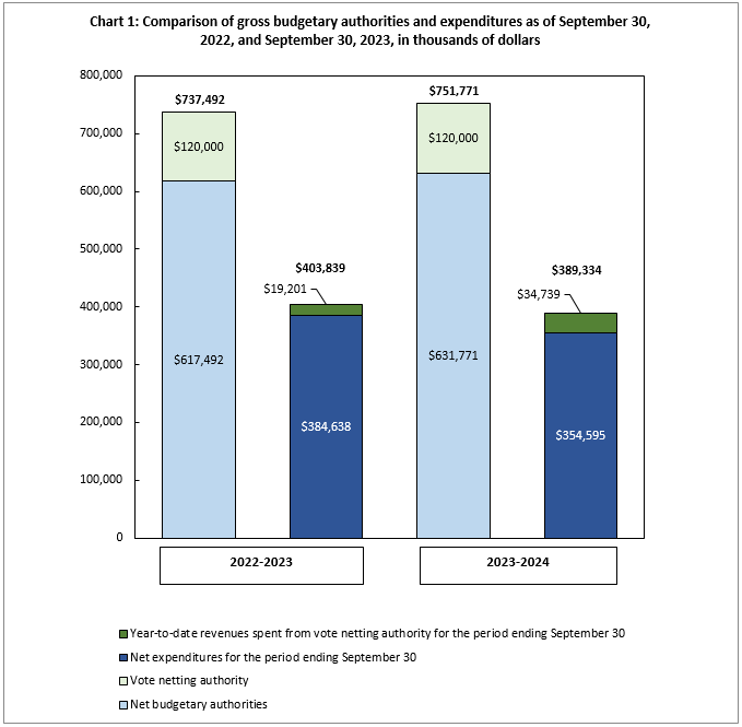 Total authorities available for 2023-24 have increased by $14.3 million, or 1.9%, from the previous year, from $737.5 million to $751.8 million (Chart 1). The net increase is mostly the result of the following: