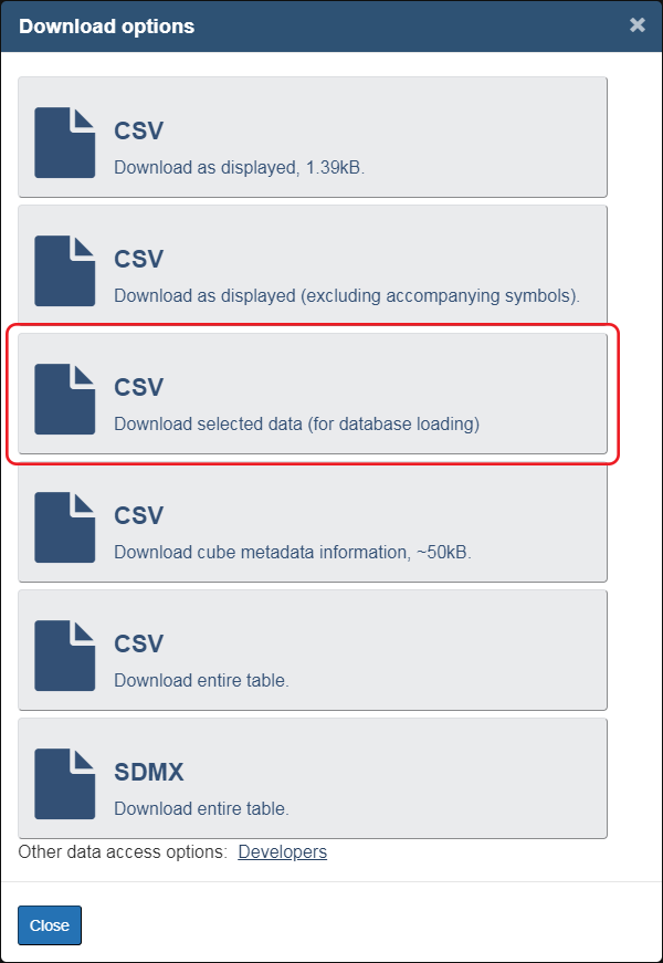 • If you want to download data when you have initially first retrieved your table, then select the 'Download options' button. You can Download as displayed (in .CSV format), Download as displayed (excluding accompanying symbols) (in .CSV format), Download entire table (in .CSV format), or Download entire table (in SDMX format).