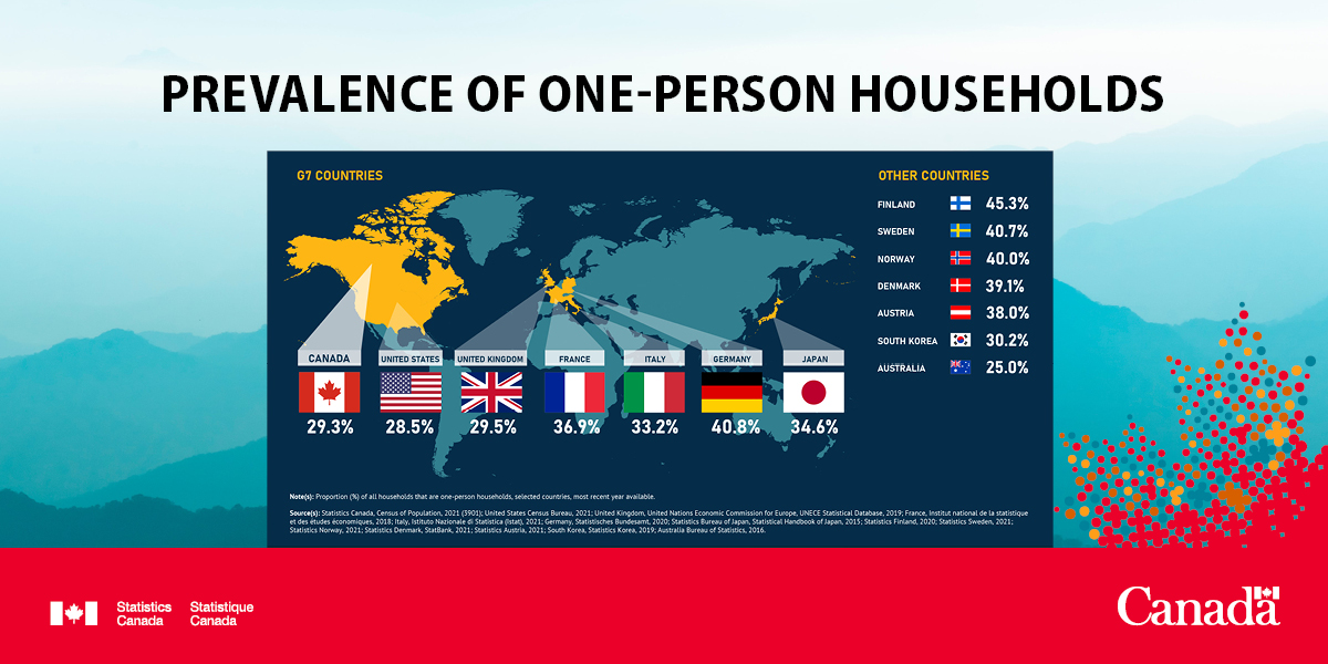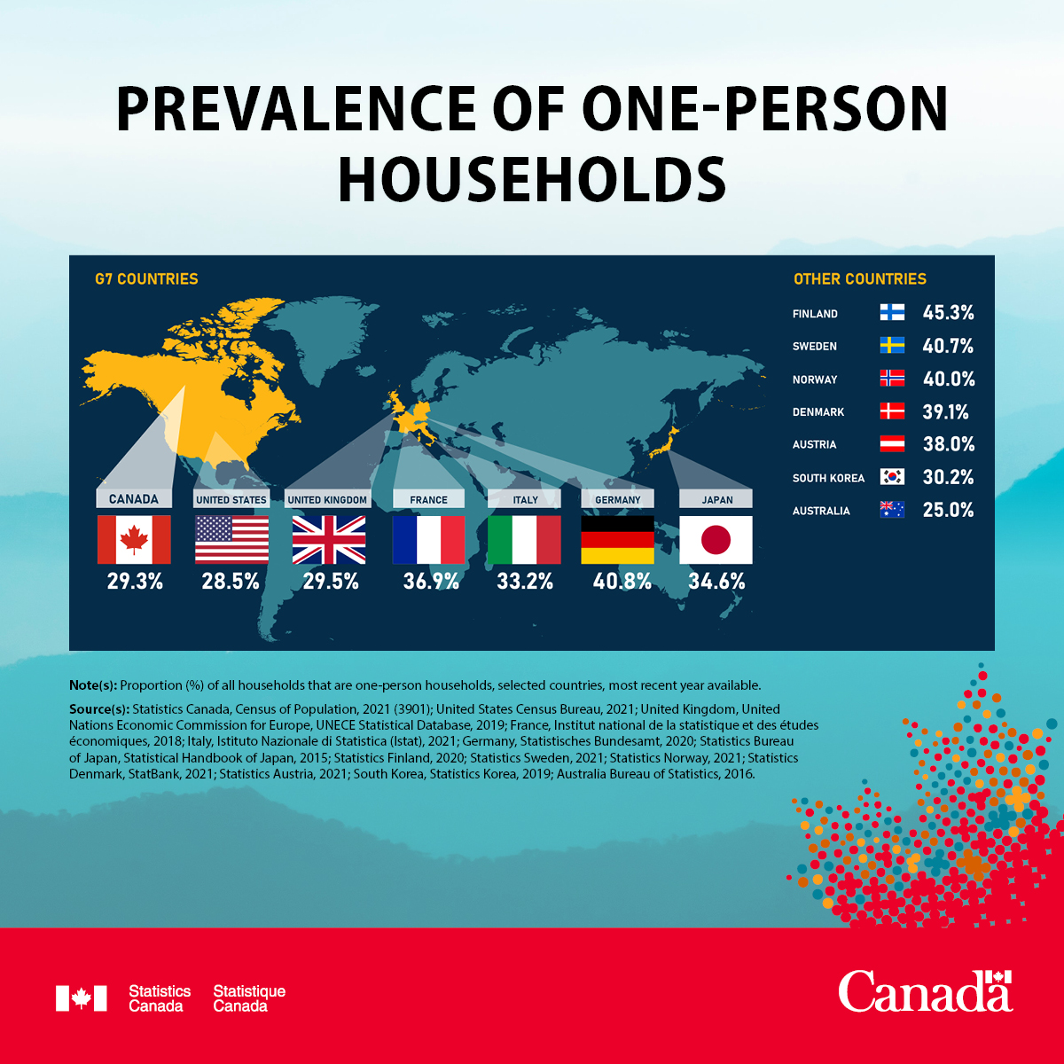 Source(s): Statistics Canada, Census of Population, 2021 (3901); United States Census Bureau, 2021; United Kingdom, United Nations Economic Commission for Europe, UNECE Statistical Database, 2019; France, Institut national de la statistique et des études économiques, 2018; Italy, Istituto Nazionale di Statistica (Istat), 2021; Germany, Statistisches Bundesamt, 2020; Statistics Bureau of Japan, Statistical Handbook of Japan, 2015; Statistics Finland, 2020; Statistics Sweden, 2021; Statistics Norway, 2021; Statistics Denmark, StatBank, 2021; Statistics Austria, 2021; South Korea, Statistics Korea, 2019; Australia Bureau of Statistics, 2016.