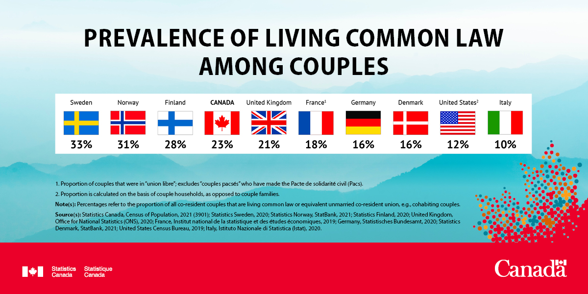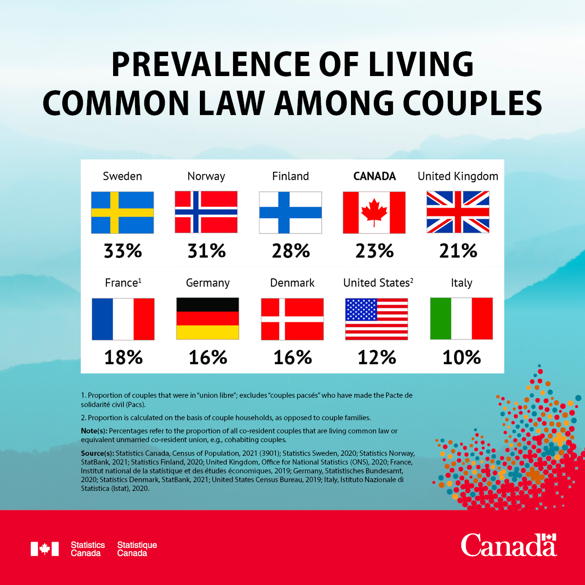 - Among G7 countries, Canada has the highest share of couples that are living common law (23%), owing to the popularity of this type of union in Quebec—home to 43% of Canada's common-law couples. Excluding Quebec, the share of common-law couples in Canada would have been 17% in 2021.