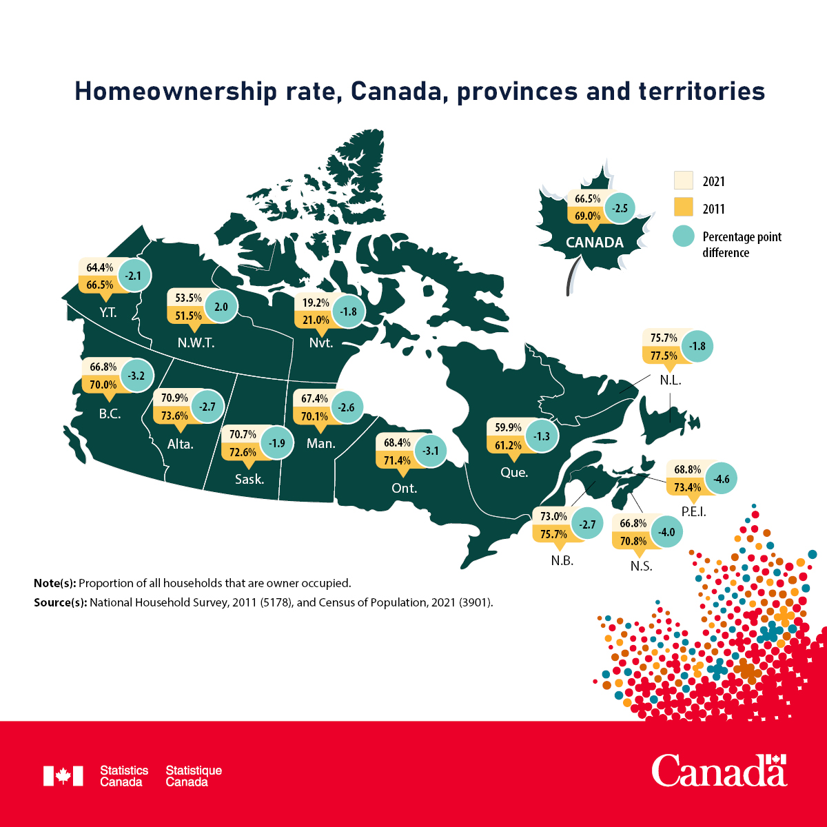 In Canada, the homeownership rate in 2021 was 66.5%, and it fell 2.5 percentage points from 69.0% in 2011.