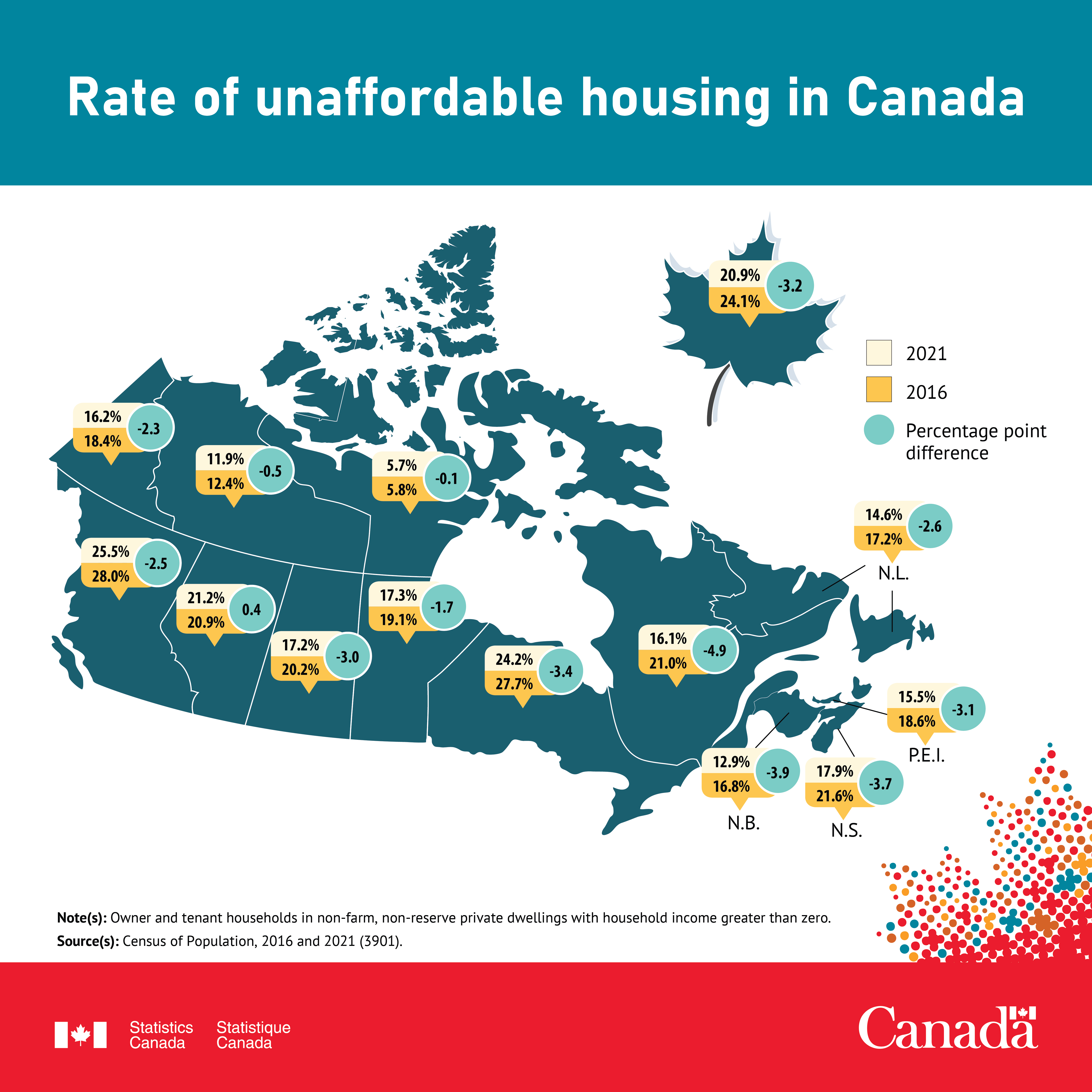 - The rate of unaffordable housing, or the proportion of households that spent 30% or more of their income on shelter costs, fell from 24.1% in 2016 to 20.9% in 2021.