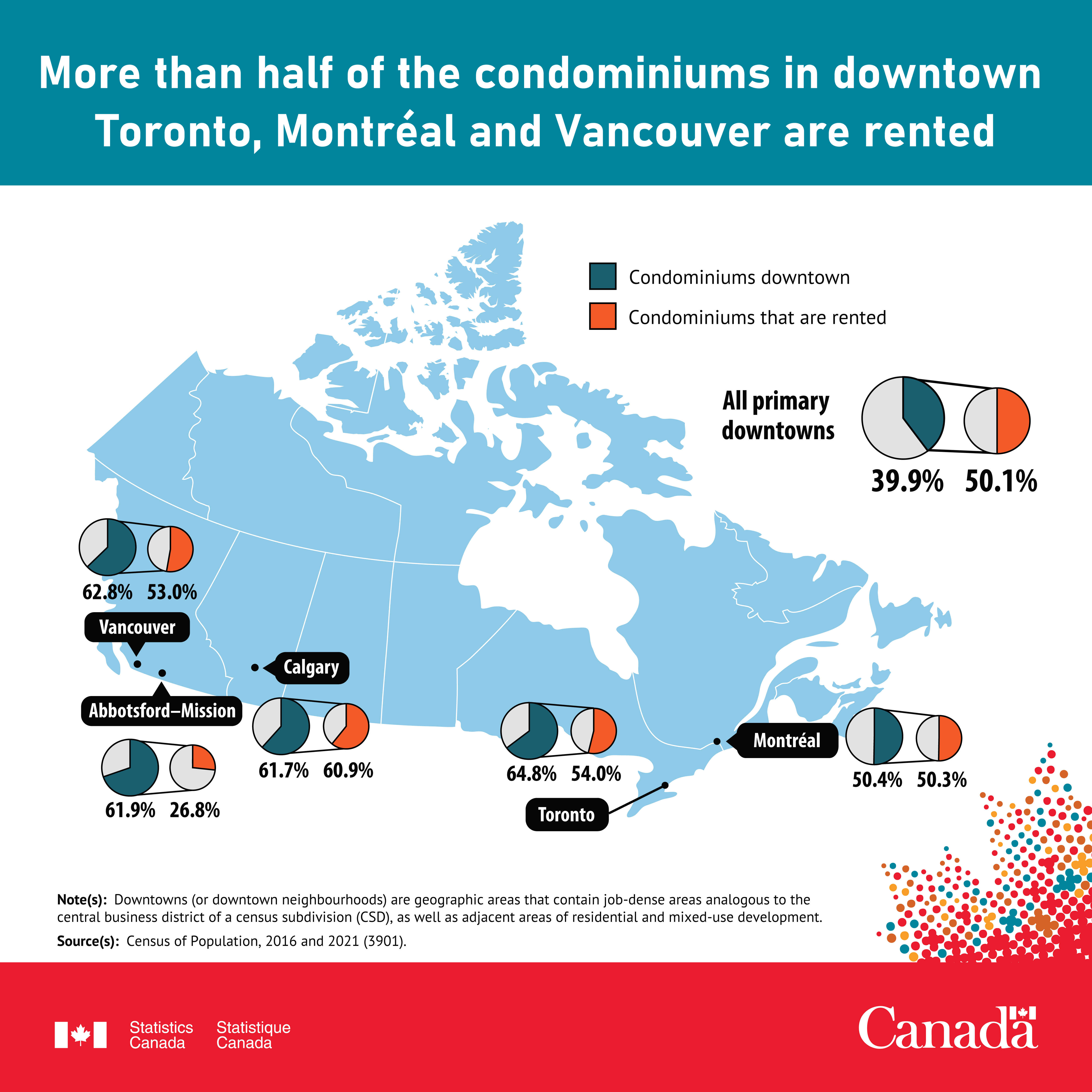 - In Canada's census metropolitan areas, condominiums make up 39.9% of the occupied stock in the primary downtowns in 2021, and half of these downtown condos are being rented out by investors.