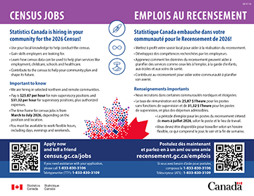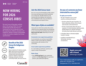 The next Census of Population will take place in the spring of 2026. The census provides high-quality data that your community can use to help plan services like employment, childcare, education, and healthcare. Statistics Canada is hiring people to help communities complete their census questionnaires.