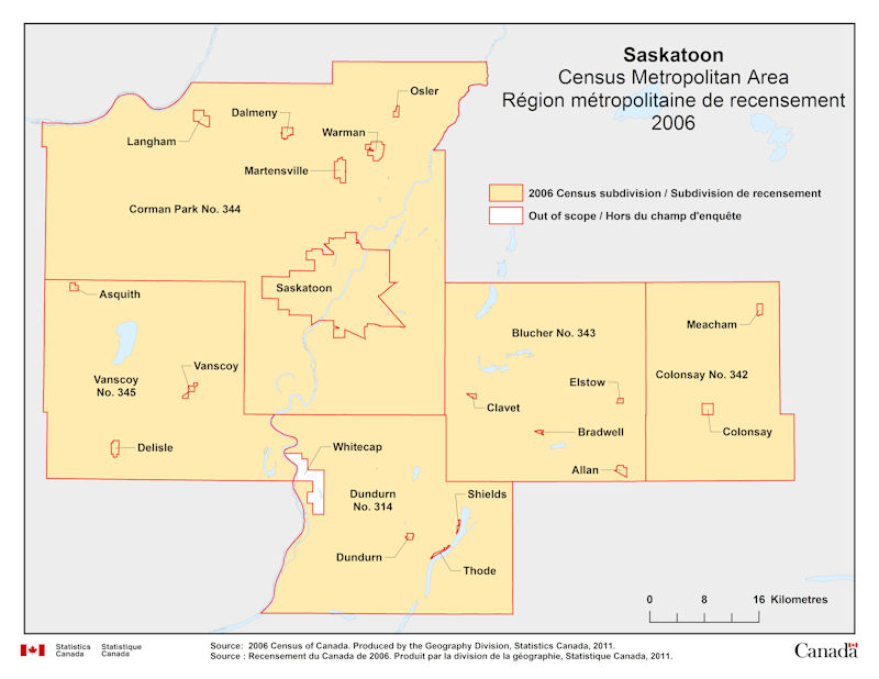 Geographical map of 2006 Census Metropolitan Area of Saskatoon, Saskatchewan. The following Census subdivisions and Out of scope are listed within this region: