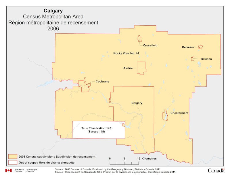Geographical map of 2006 Census Metropolitan Area of Calgary, Alberta. The following Census subdivisions and Out of scope are listed within this region: