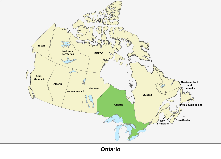 This map outlines the provinces and territories of Canada. There are ten provinces and three territories and they cover all of Canada. The province of Ontario is shown in green.