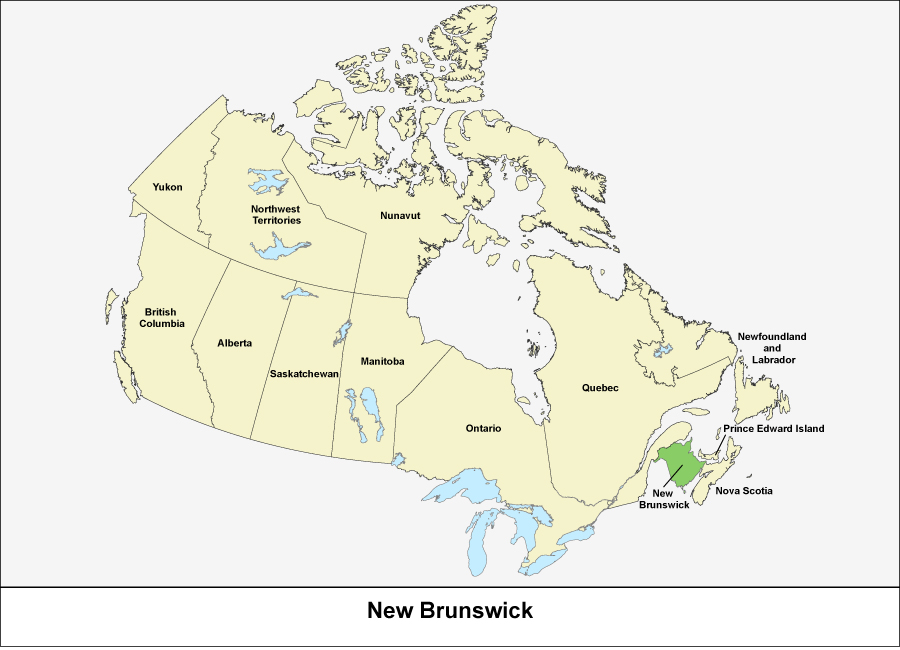 This map outlines the provinces and territories of Canada. There are ten provinces and three territories and they cover all of Canada. The province of New Brunswick is shown in green.