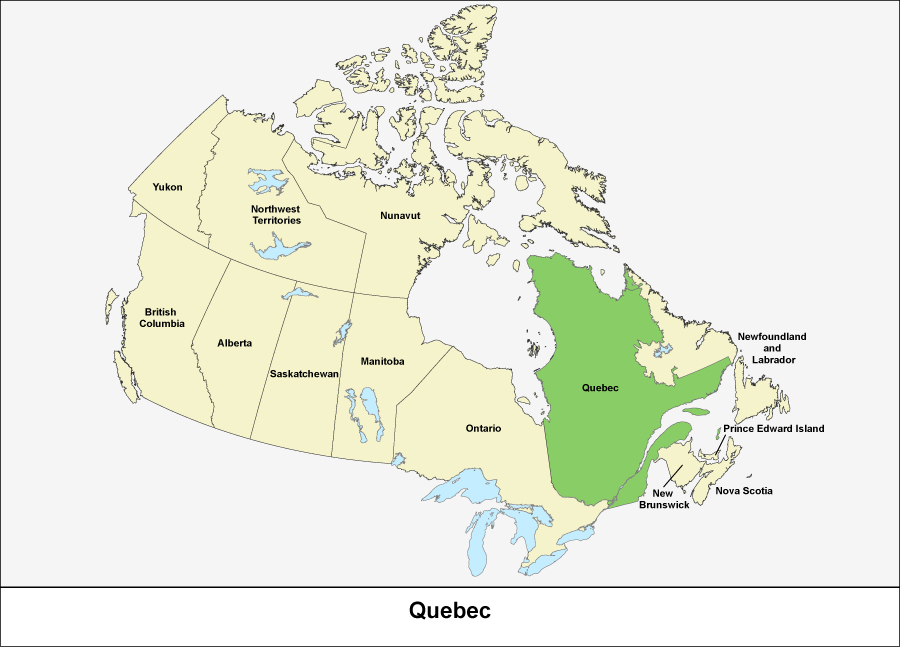 This map outlines the provinces and territories of Canada. There are ten provinces and three territories and they cover all of Canada. The province of Quebec is shown in green.