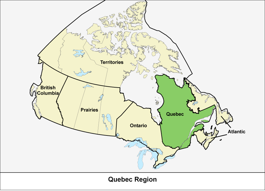 This map outlines the geographical regions of Canada. There are six geographical regions and they cover all of Canada. The Quebec Region is shown in green.