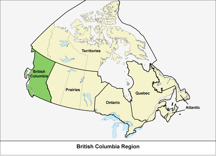 This map outlines the geographical regions of Canada. There are six geographical regions and they cover all of Canada. The British Columbia Region is shown in green.