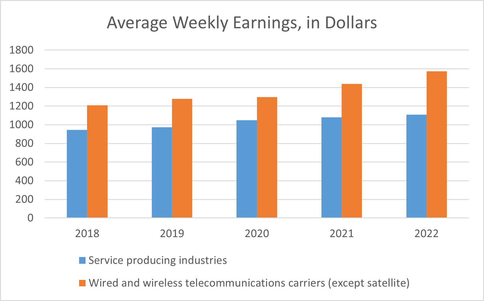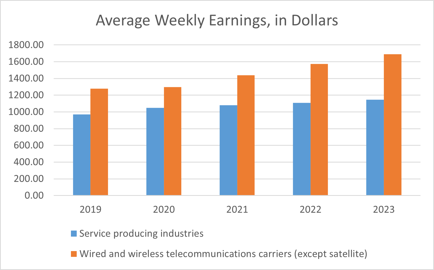 In 2023, the average weekly earnings for the wired and wireless telecommunications industry was $1,691, or $87,920 on an annual basis. This is higher than the service industry average weekly earnings of $1,146, or $59,573 on an annual basis. More information on average weekly earnings