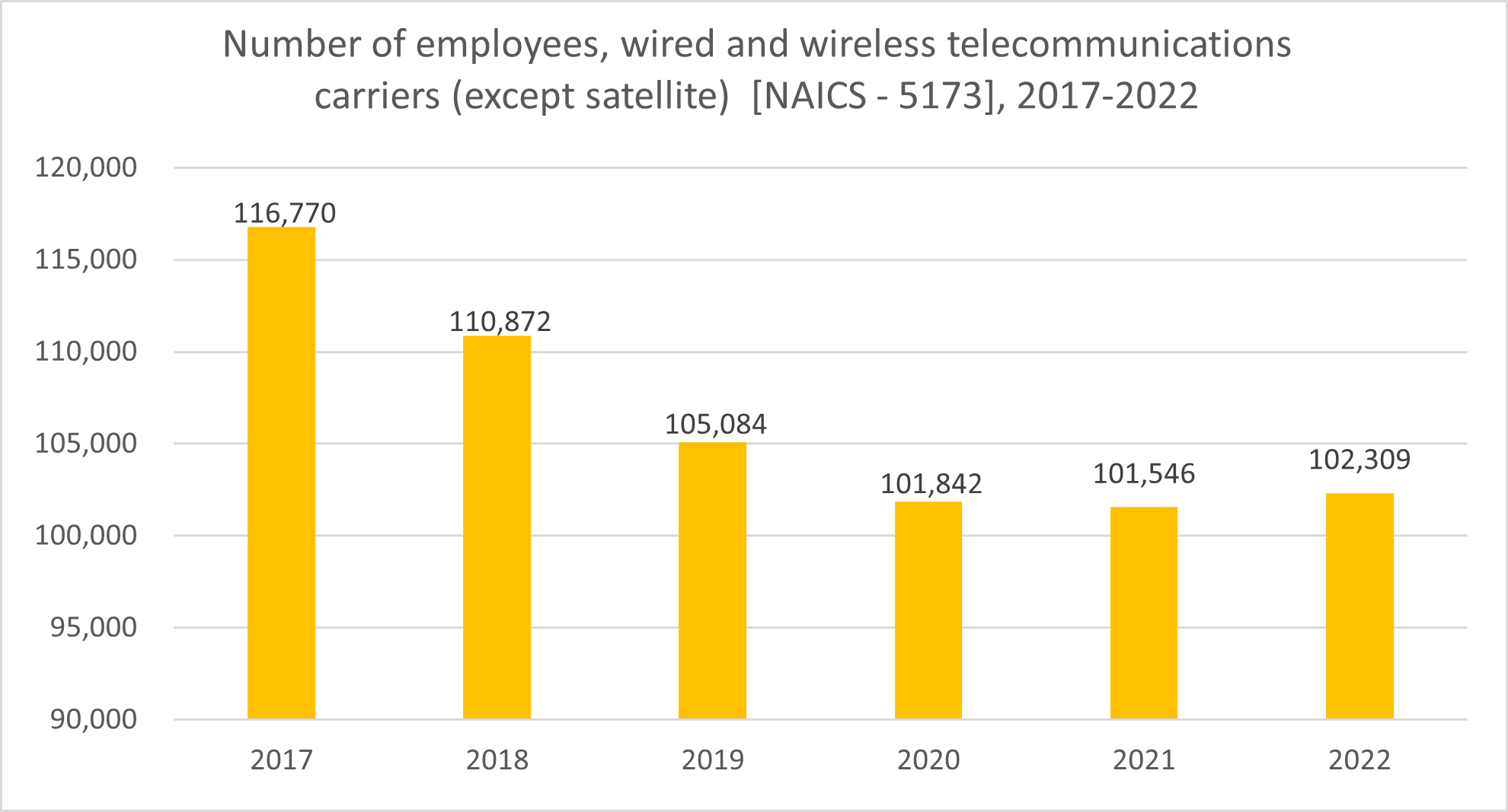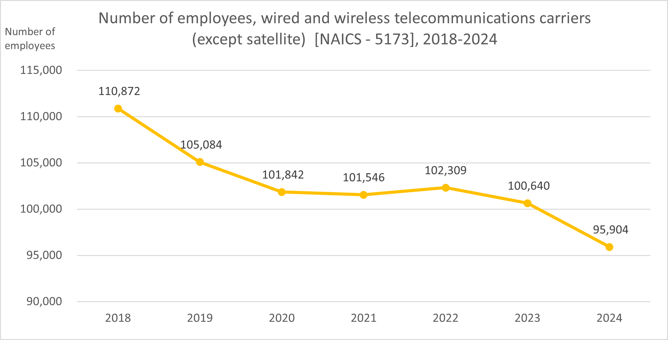 In 2024, the wired and wireless telecommunications industry employed 95,905 people. More information