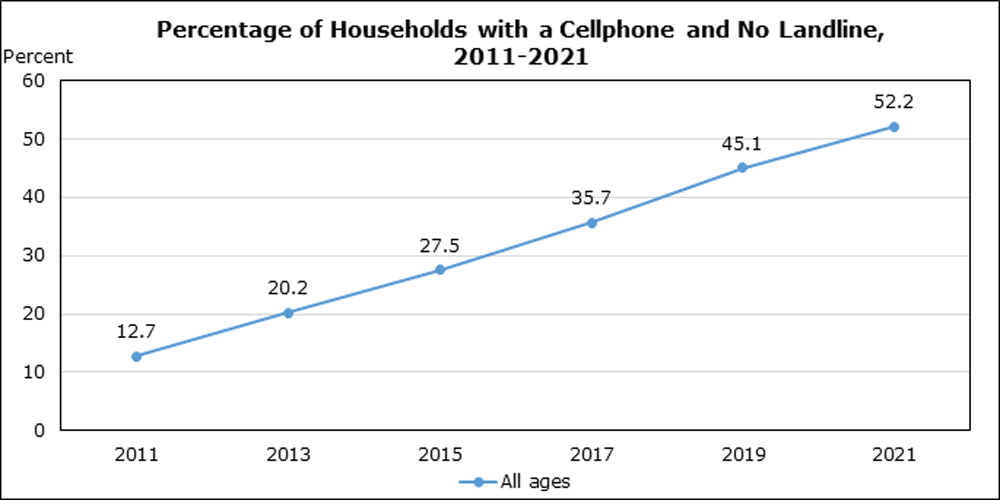 In 2023, 60.9% of households in Canada reported they had a cellphone and no landline, up from 20.2% in 2013. Close to 90% of households with a respondent less than 30 years old reported they had a cellphone and no landline. More information on cord cutting