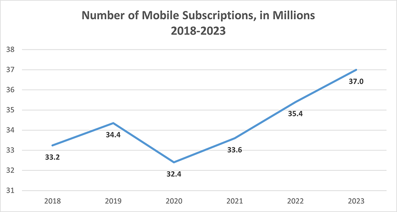 The number of subscriptions to mobile services in Canada was 37.0M in 2023, up from 35.4M in 2022. More information on mobile subscriptions