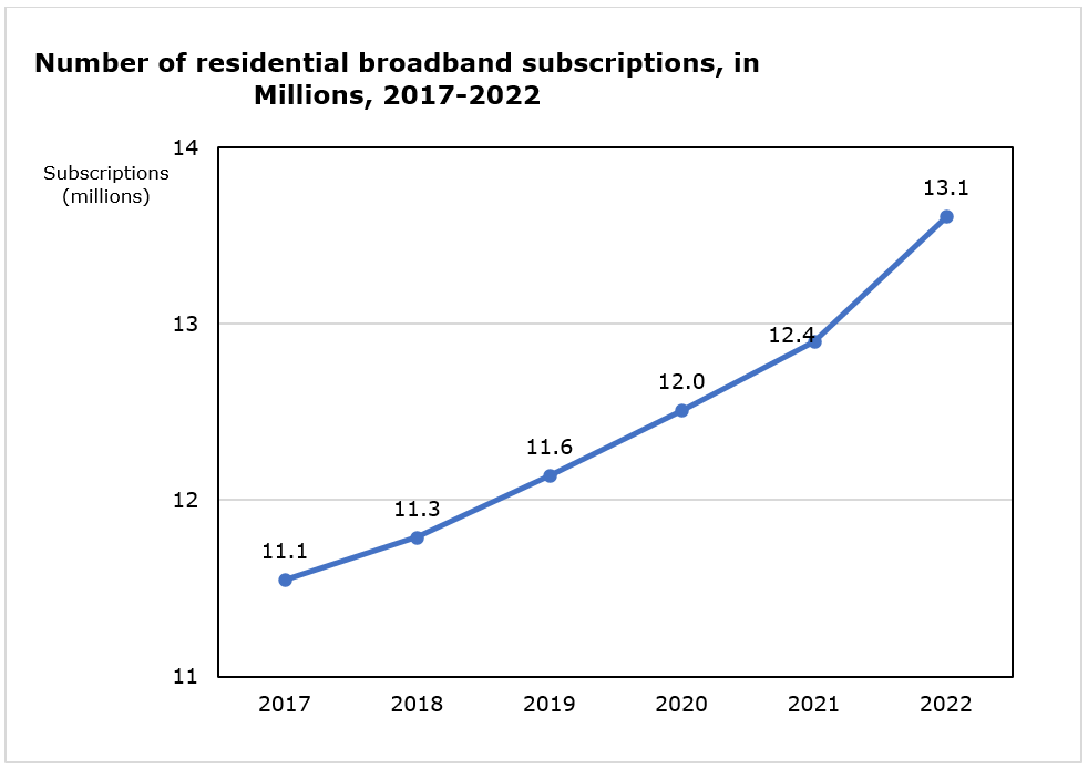 The number of residential broadband Internet subscriptions in Canada was 13.5M in 2023, up from 13.1M in 2022.