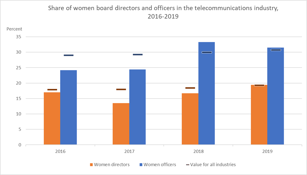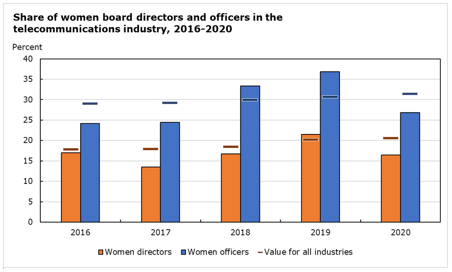 In 2020, women held 16.4% of director board seats and 26.8% of officer positions in the telecommunications industry. More information on Share of women in executive positions