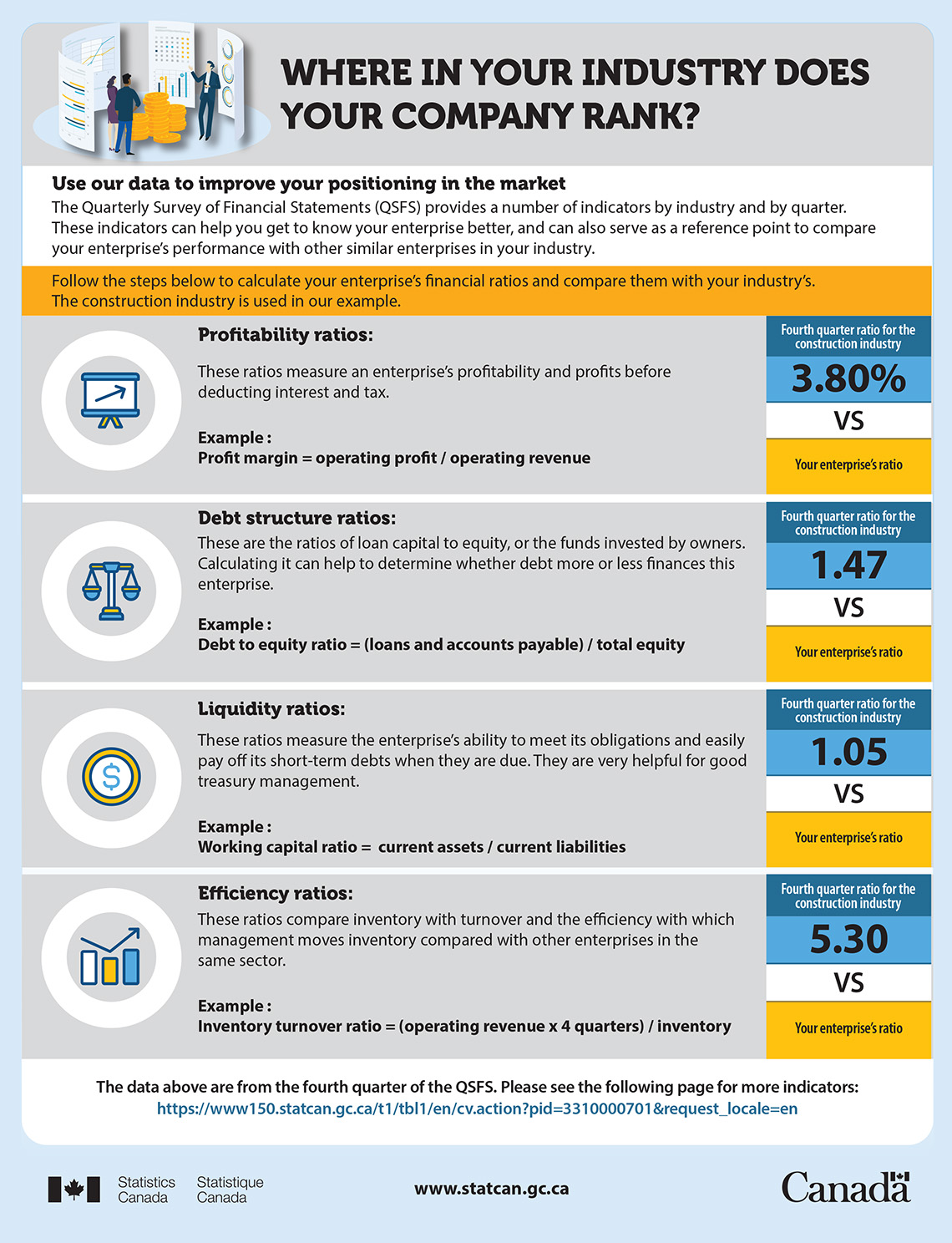 The Quarterly Survey of Financial Statements (QSFS) provides a number of indicators by industry and by quarter. These indicators can help you get to know your enterprise better, and can also serve as a reference point to compare your enterprise's performance with other similar enterprises in your industry.