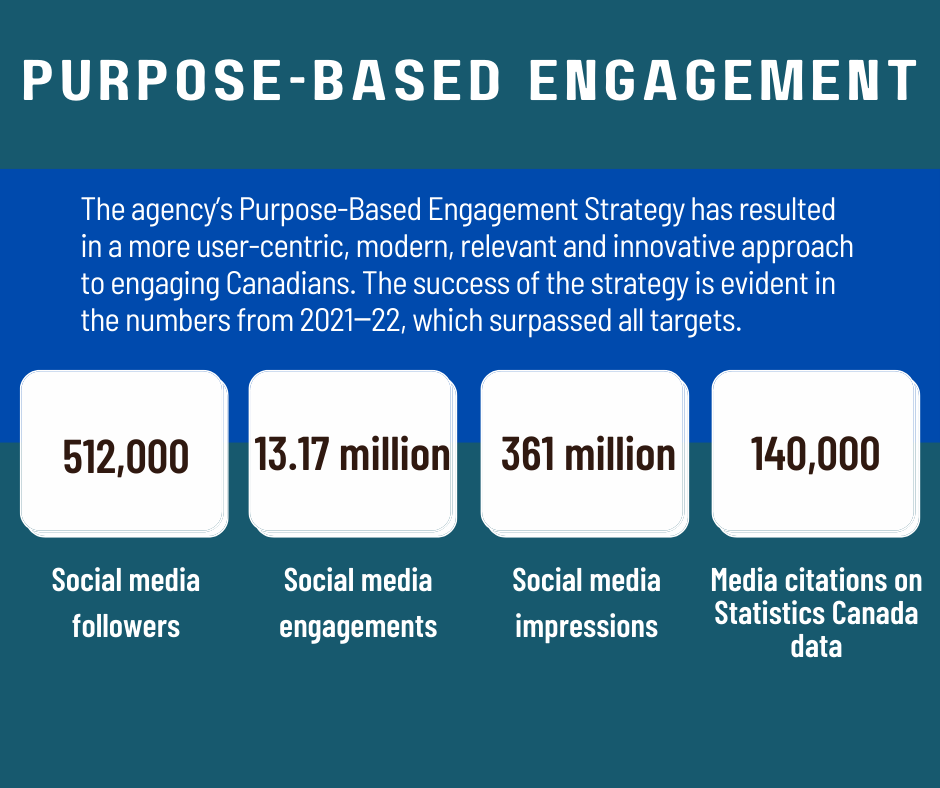 The agency's Purpose-Based Engagement Strategy has resulted in a more user-centric, modern, relevant and innovative approach to engaging Canadians. The success of the strategy is evident in the numbers from 2021-22
