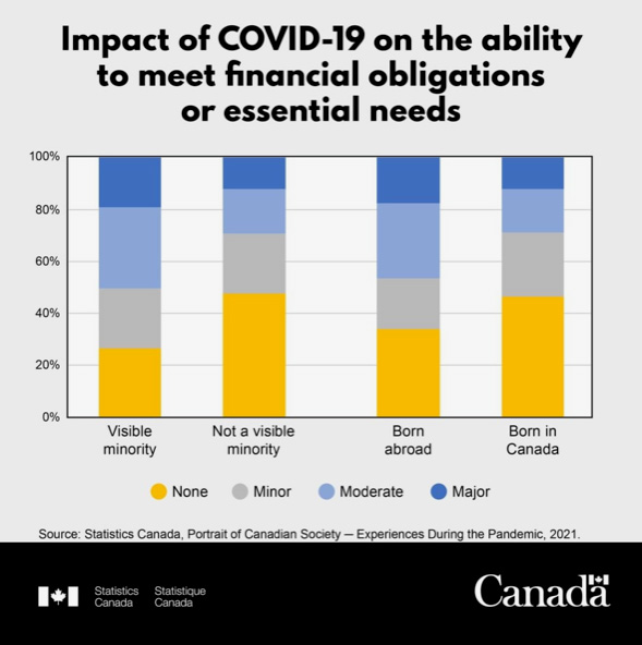 Impact of COVID-19 on the ability to meet the financial obligations or essential needs No impact Minor impact Moderate impact Major impact Visible minority 27% 23% 31% 19% Not a visible minority 48% 23% 17% 12% Born abroad 34% 19% 29% 18% Born in Canada 46% 25% 17% 12% Source: Portrait of Canadian Society – Experiences During the Pandemic (PCS2), 2021. - continued to provide an insightful picture of the labour market impacts of COVID-19 across multiple societal segments, including sex, age and ethnocultural groups and other vulnerable populations, through The Daily