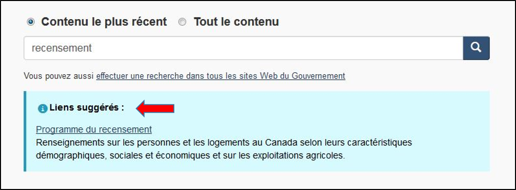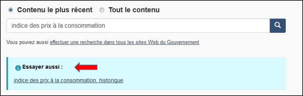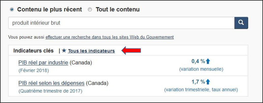 Situé au-dessus des résultats de recherche, les indicateurs clés offrent un accès plus facile aux principaux indicateurs de statistiques économiques et sociales de Statistique Canada. Voir tous les indicateurs en cliquant sur le lien « Tous les indicateurs ».