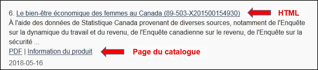 Le titre vedette qui s'affiche dans les résultats de recherche est lié directement à la page html. Pour accéder à la page du catalogue, vous devez sélectionner le lien « Information du produit ».