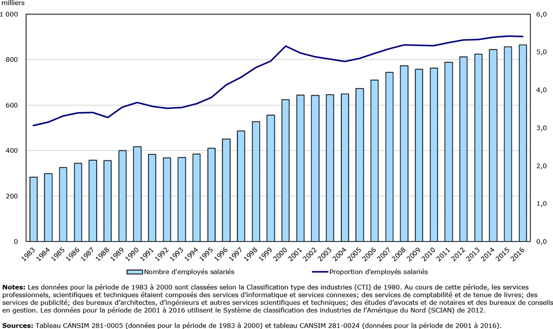 Notes: Les données pour la période de 1983 à 2000 sont classées selon la Classification type des industries (CTI) de 1980. Au cours de cette période, les services professionnels, scientifiques et techniques étaient composés des services d'informatique et services connexes; des services de comptabilité et de tenue de livres; des services de publicité; des bureaux d'architectes, d'ingénieurs et autres services scientifiques et techniques; des études d'avocats et de notaires et des bureaux de conseils en gestion. Les données pour la période de 2001 à 2016 utilisent le Système de classification des industries de l'Amérique du Nord (SCIAN) de 2012.