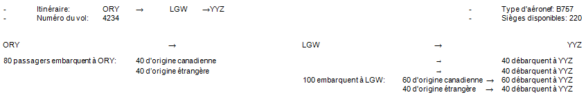 Pour un vol ayant 1 origine et 1 destination, le nombre de passagers embarqués à A est égal au nombre de passagers débarqués à B. L'aéronef est chargé à A et complètement déchargé à B. À noter que les passagers d'origine canadienne et d'origine étrangère doivent être comptés séparément mais être inscrits sur la même ligne. Un exemple numérique est expliqué à la page suivante.