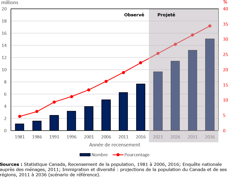 | Sources : Statistique Canada, Recensement de la population, 1981 à 2006, 2016; Enquête nationale auprès des ménages, 2011; Immigration et diversité : projections de la population du Canada et de ses régions, 2011 à 2036 (scénario de référence). | ||